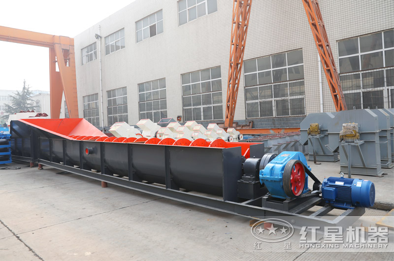 洗石機(jī)由槽體、減速機(jī)、電機(jī)、中心軸、螺旋葉片、支架組成。支架焊接在中心軸上,螺旋葉片裝好后用螺栓壓緊,使葉片不下垂不變形,有效延長設(shè)備的使用壽命。