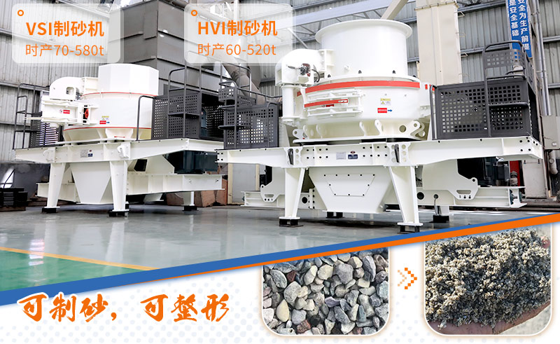 制砂機(jī),兼具整形效果,將中細(xì)碎后的砂石料進(jìn)行制砂整形,成品料粒度在0-5mm,粒形好,品質(zhì)高,設(shè)備自動(dòng)化程度高,安全可靠,耐用易保養(yǎng),節(jié)能環(huán)保,有三個(gè)HX、VSI和HVI三個(gè)系列,推薦型號(hào)HVI 0922(時(shí)產(chǎn)70-210噸)、VSI 8518(時(shí)產(chǎn)140-260噸)。